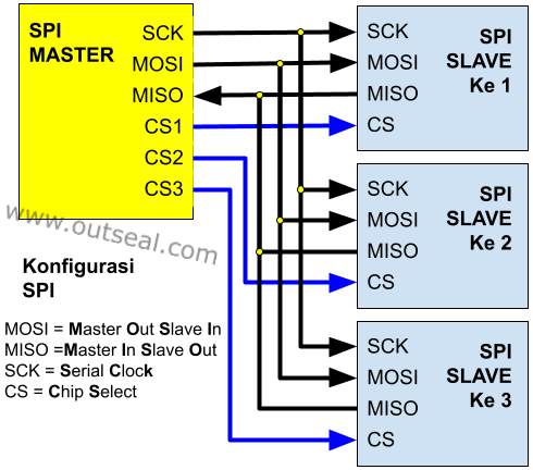 SPI adalah salah satu jalur komunikasi serial antara master dan slave yang dilakukan secara singkron yang artinya clock data dikendalikan oleh master. Berikut adalah konfigurasi umum untuk komunikasi SPI