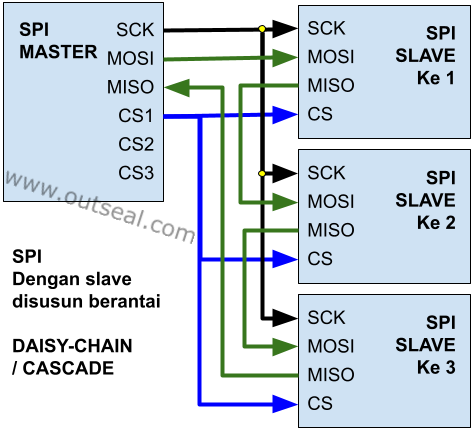 Setiap slave dikendalikan oleh satu pin kontrol dari master. Pin ini digunakan untuk memilih slave mana yang ingin diajak berkomunikasi. Hal ini menjadikan konfigurasi SPI membutuhkan banyak kabel jika diinginkan banyak jalur komunikasi. Namun salve-slave ini juga bisa dipasang secara serial atau berantai (daisy-chain / cascade ) untuk menghemat jumlah pin kontrol. Konfigurasi berantai ini ada kelemahan dan keunggulannya yang tidak dibahas pada tulisan ini. Berikut adalah gambar konfigurasi SPI dengan slave dipasang berantai (dasiy-chain)