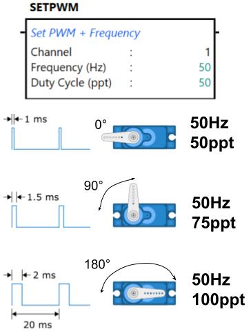Mengacu pada datasheet tersebut, sudut servo dari 0 hingga 180 derajat dapat di kontrol oleh sebuah pulsa PWM dengan panjang gelombang 20ms dengan fase ON dari 1 hingga 2ms. panjang gelombang 20ms didapatkan dengan mengatur frekuensi pada 50Hz yang berarti dalam 1 detik terdapat 50 pulsa/gelombang sehingga periode/panjang gelombangnya adalah 1000ms/50Hz = 20ms. Fase ON dari 1 hingga 2ms didapatkan dengan mengatur duty-cycle nya. Duty cycle pada instruksi PWM ditulis dalam bentuk ppt (1/1000). Oleh karena itu pada frekuensi 50Hz, 1 ppt = 20ms/1000 = 0.02ms. Untuk mendapatkan fase ON sebesar 1ms, nilai duty-cycle dihitung dengan 1ms/0.02ms = 50. Sedangkan untuk mendapatkan fase ON sebesar 2ms, nilai duty-cycle dihitung dengan 2ms/0.02ms = 100. Dari perhitungan tersebut diketahui bahwa untuk mendapatkan fase ON 1 hingga 2ms pada frekuensi 50Hz diperlukan duty-cycle dengan nilai 50 hingga 100.